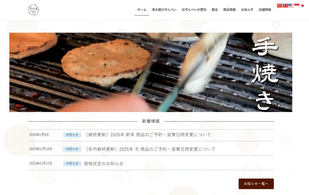 HOME > 制作実績 > ホームページ制作 > ホームページ制作 制作実績 清水屋せんべい店様 2026年3月3日 創業100年を超えた記念となるホームページ制作をさせていただきました。外国人のお客様もいらっしゃるとのことで、外国語にも対応。しっかり噛みしめられる、とても美味しいおせんべい屋さんです。本当に美味しいんですよ。 動画制作者の映像制作協同組合 彩→irodori← の、吉田 まさみちさんと連携を取りながらの制作でした。越谷市内のクリエイターと連携できる、楽しい案件でした。 画像をクリックすると、サイトが表示されます。 -ホームページ制作, 制作実績